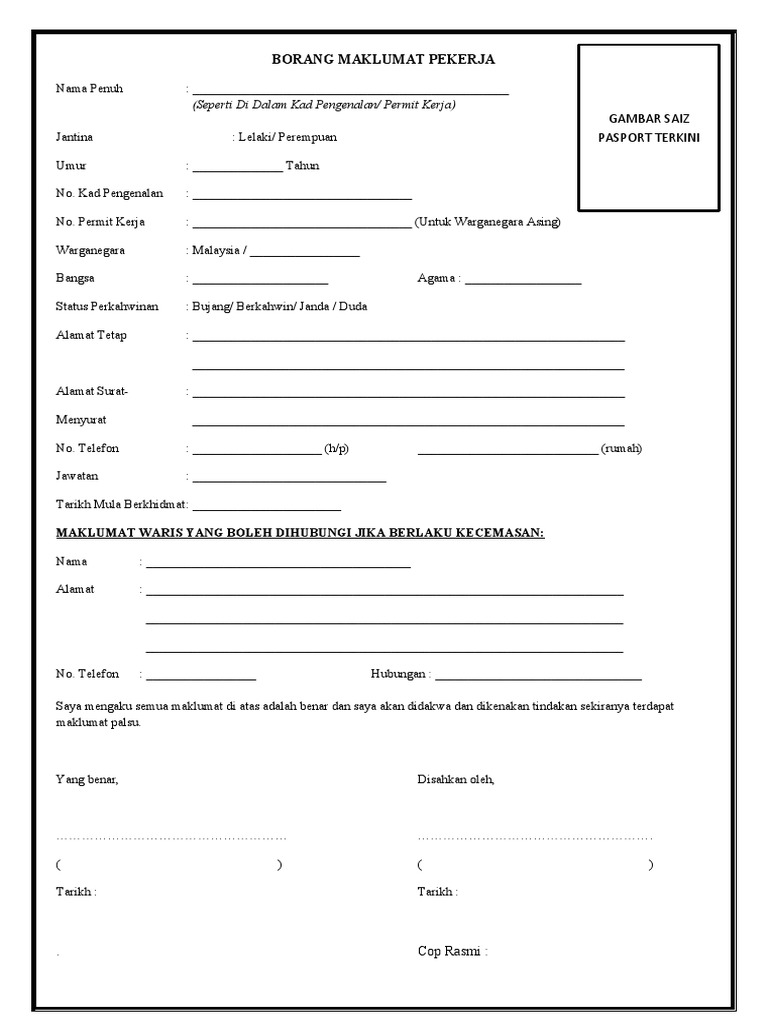 Untitled Form Human Resource Management Studocu from d20ohkaloyme4g.cloudfront.net 13 bilangan pekerja asing yang sedang digajikan (tidak termasuk yang baru digajikan di perkara 11) number of foreign employees employed (not including newly employed in para 11). Borang maklumat peribadi kakitangan jabatan sumber manusia. Borang pekerja contoh bulanan (apcb). Dapatkan borang a yang baru di kaunter. Kurangnya 2 minggu lebih awal daripada tarikh in vois/tuntutan terkini dihantar kepada usm. Borang maklumat peribadi guru bil butir peribadi 1 nama: Pk19 1 borang borang untuk majikan mengisi butiran pekerja baru. Nombor majikan mesti ditulis di belakang cek 2.