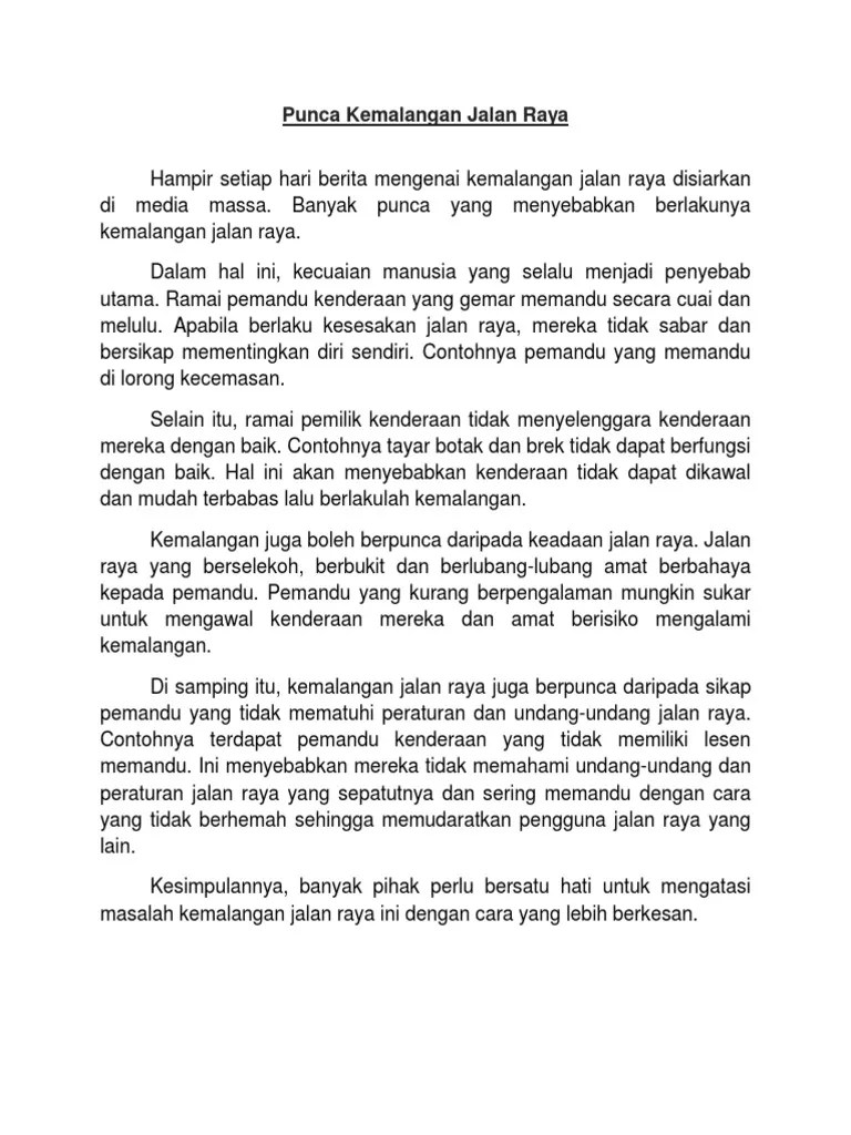 Jalan raya yang tidak diselenggara dengan baik sudah pasti mendatangkan bahaya kepada para pemandu dan juga penunggang. Langkah untuk mengurangkan kemalangan jalan raya. Kemalangan yang berlaku di jalan raya semakin meningkat. Learn bahasa malaysia creatively from probably the most creative bm coach ! Keadaan jalan raya juga merupakan antara punca kemalangan berlaku di negara ini. Karangan langkah langkah mengurangkan kemalangan jalan raya. Kemalangan di jalan raya menyebabkan ahli keluarga kehilangan anggota yang. Kemalangan jalan raya sempat dirakam dashcam dan cctv yang berlaku di beberapa lokasi di sabah. Dasawarsa ini, sama ada kita sedar atau tidak lantaran terlalu dihidangkan. Karangan berbentuk kemalangan jalan raya merupakan satu jenis karangan yang sangat popular di sekolah, tidak kiralah di i peringkat upsr,pmr mahupun spm. Kita berkerjasama mengurangkan kemalangan jalan raya supaya kita dapat hidup dalam keadaan aman damai. Kemalangan jalan raya mengeluarkan mangsa tersepit sudah tidak bernyawa hati hati ketika memandu gais pakai seatbelt. Terdapat pelbagai jenis kemalangan sama ada yang melibatkan pemandukereta,lori, penunggang motosikal, atau pejalan kaki dilaporkan oleh pihak.